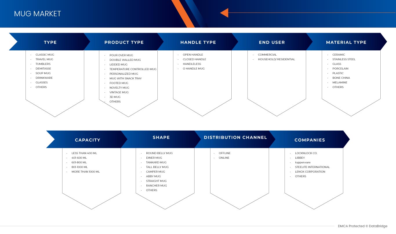 Marktsegmentierung für Tassen in den USA nach Typ (klassische Tassen, Reisetassen, Trinkgläser, Mokkatassen, Suppentassen, Trinkgefäße, Gläser und andere), Materialtyp (Keramik, Edelstahl, Glas, Porzellan, Kunststoff, Bone China, Melamin und andere), Produkttyp (Übergießbecher, doppelwandige Tassen, Tassen mit Deckel, temperaturgeregelte Tassen, personalisierte Tassen, Tassen mit Snack-Tablett, Tassen mit Fuß, originelle Tassen, Vintage-Tasse, 3D-Tasse und andere), Fassungsvermögen (weniger als 400 ml, 401–600 ml, 601–800 ml, 801–1000 ml und mehr als 1000 ml), Henkeltyp (offene Henkel, geschlossene Henkel, henkellose Tassen und Tassen mit O-Henkel), Form (runde bauchige Tassen, Diner-Tasse, Krugtasse, hohe bauchige Tassen, Camper-Tasse, Abby-Tasse, gerade Tassen, Rancher-Tasse und andere), Endverbraucher (gewerblich und privat), Vertriebskanal (Offline und Online) – Branchentrends und Prognose bis 2032