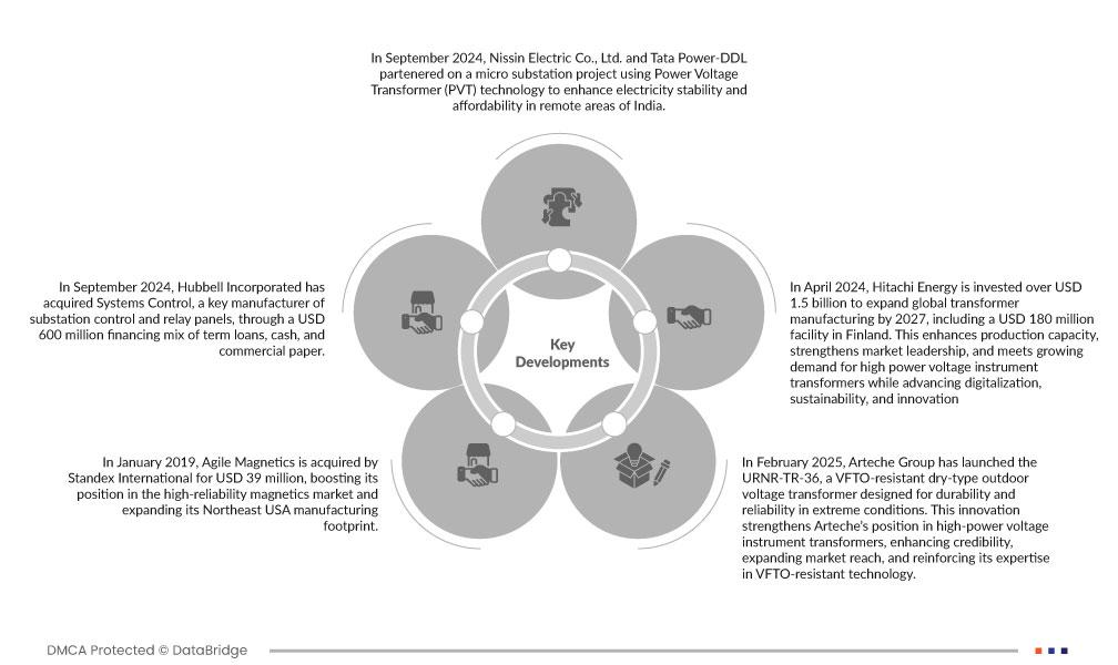 - En septiembre de 2024, Hubbell Incorporated adquirió Systems Control, un fabricante clave de paneles de control y relés para subestaciones, mediante una financiación de 600 millones de dólares estadounidenses, compuesta por préstamos a plazo, efectivo y papel comercial. Esta adquisición fortalece la posición de Hubbell en el sector de transformadores de medida de alta tensión al ampliar sus soluciones de control de subestaciones, reforzar la fiabilidad de la red y fortalecer su papel en infraestructuras eléctricas críticas.