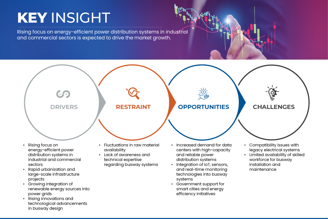 - Le marché des systèmes de barres omnibus connaît une forte croissance mondiale, portée par la demande croissante de systèmes de distribution écoénergétiques, la construction accrue d'installations commerciales et industrielles et la modernisation impérative des infrastructures électriques vieillissantes. L'essor des bâtiments intelligents, l'adoption des énergies renouvelables et l'intégration des systèmes électriques dans l'automatisation industrielle contribuent également à cette expansion. Toutefois, cette expansion est freinée par des coûts initiaux élevés, la complexité des rénovations des systèmes existants et la nécessité de se conformer aux normes et réglementations électriques régionales telles que les normes CEI, NEC et UL.