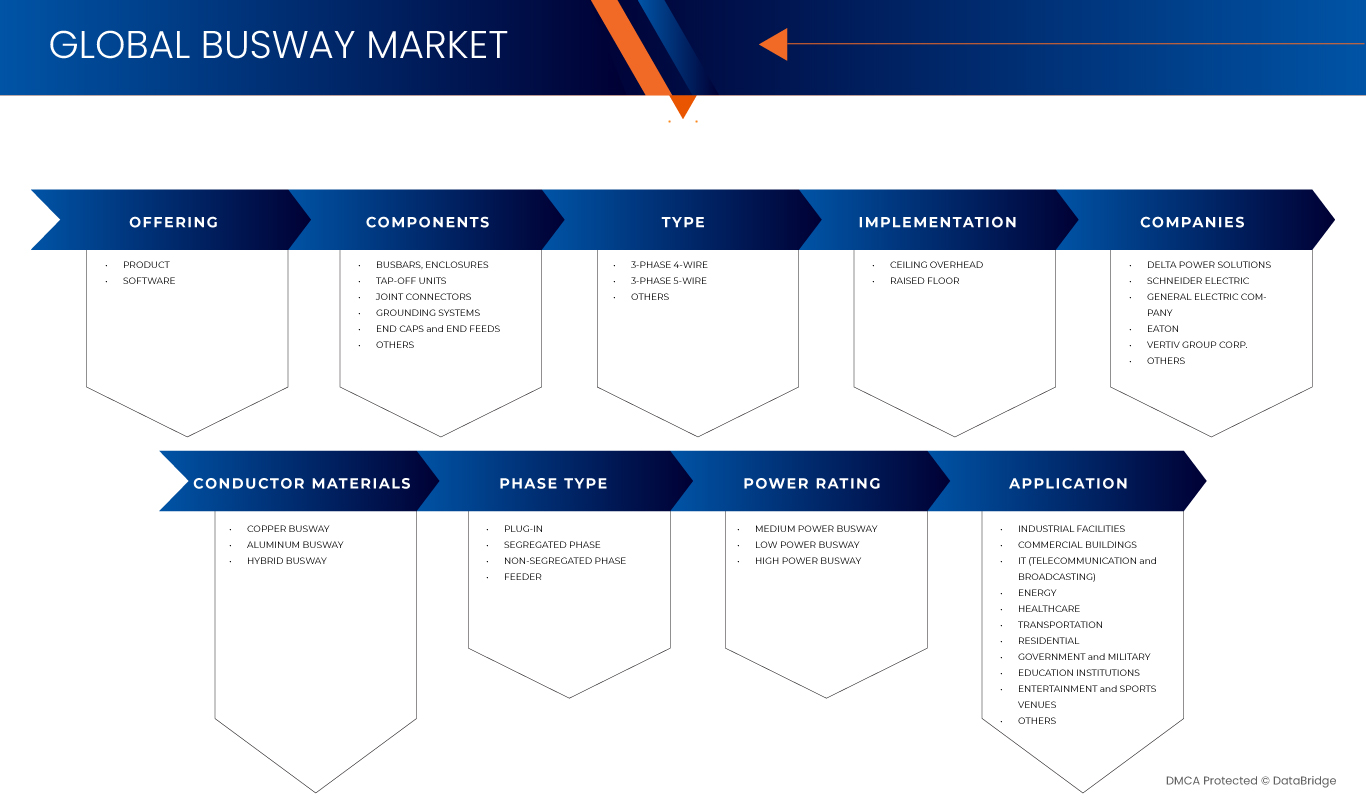 Segmentation du marché mondial des barres omnibus, par offre (produit et service), composants (barres omnibus, boîtiers, unités de dérivation, connecteurs, embouts et alimentations, et système de mise à la terre), type (triphasé 4 fils, triphasé 5 fils), mise en œuvre (plafond et plancher technique), lieu d'installation (intérieur et extérieur), matériau conducteur (barres omnibus en cuivre, en aluminium et hybrides), type de phase (phases séparées, phases non séparées, enfichables et alimentations), puissance nominale (basse, moyenne et haute puissance), application (informatique (télécommunications et radiodiffusion), résidentiel, bâtiments commerciaux, installations industrielles, santé, transports, établissements d'enseignement, énergie, administration et armée, lieux de divertissement et sportifs, et autres) - Tendances et prévisions du secteur jusqu'en 2032