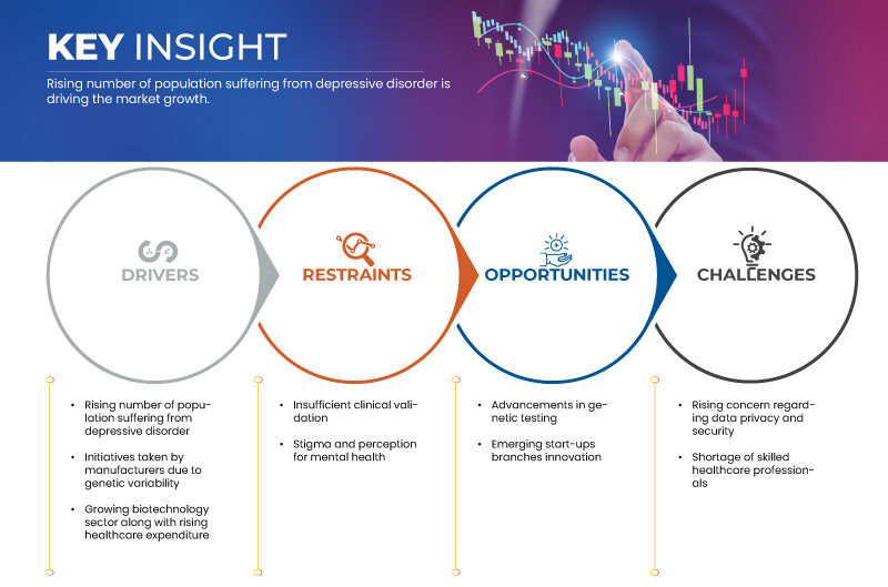 - La demande croissante de tests pharmacogénétiques en psychiatrie et dans le traitement de la dépression est principalement motivée par la prévalence croissante des troubles de santé mentale, la sensibilisation croissante des prestataires de soins de santé aux avantages de la médecine personnalisée et le soutien croissant des organismes de réglementation aux décisions thérapeutiques fondées sur la génétique.