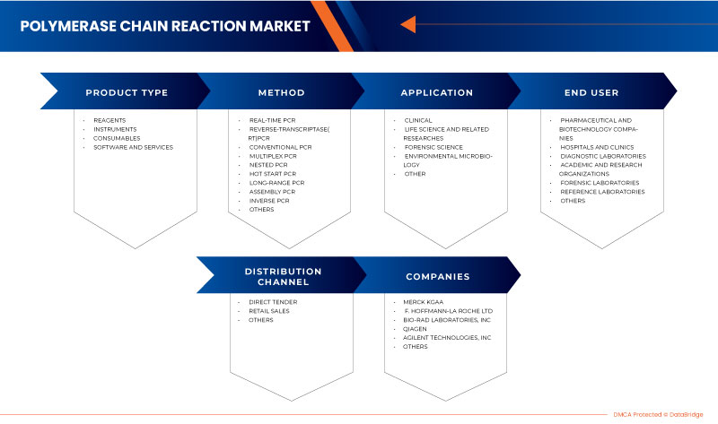 Type de produit (réactifs, instruments, consommables, logiciels et services), méthode (PCR en temps réel, PCR à transcriptase inverse (RT), PCR conventionnelle, PCR multiplex, PCR imbriquée, PCR à démarrage à chaud, PCR à longue portée, PCR d'assemblage, PCR inverse et autres), application (recherches cliniques, sciences de la vie et recherches connexes, sciences médico-légales, microbiologie environnementale et autres), utilisateur final (sociétés pharmaceutiques et biotechnologiques, hôpitaux et cliniques, laboratoires de diagnostic, organismes universitaires et de recherche, laboratoires médico-légaux, laboratoires de référence et autres), canal de distribution (appel d'offres direct, ventes au détail et autres) |