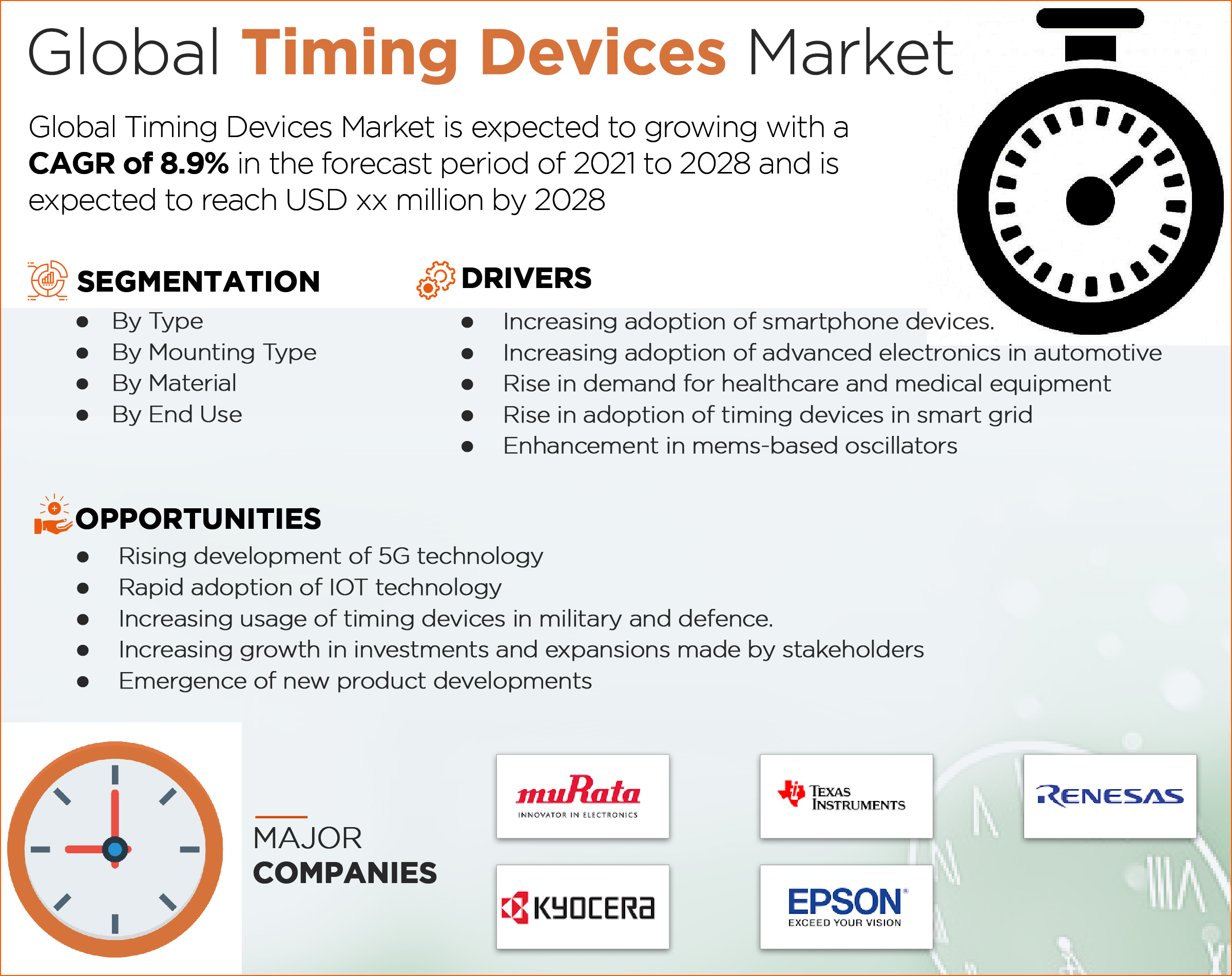 Global Timing Devices Market, By Type (Oscillator, Clock Buffer, Clock Generator, Jitter Attenuator and Resonator), Mounting Type (Surface Mount and Through Hole), Material (Silicon, Crystal and Ceramic), End Use (Consumer Electronics, Industrial, Medical and Healthcare, Automotive, Telecommunications and Datacenter, Military and Defense and Others), Country (U.S., Canada, Mexico, U.K., Germany, France, Spain, Italy, Netherlands, Switzerland, Russia, Belgium, Turkey, Rest of Europe, China, Japan, South Korea, India, Australia, Singapore, Thailand, Malaysia, Indonesia, Philippines, Rest of Asia-Pacific, South Africa, Saudi Arabia, U.A.E., Egypt, Israel, Rest of Middle East and Africa, Brazil, Argentina, Rest of South America) Industry Trends and Forecast to 2028