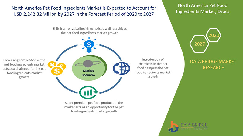 The North America pet food ingredients market is becoming more competitive every year with companies such as Ingredion Incorporated, ADM and Cargill, Incorporated as they are the market leaders for pet food ingredients. Data Bridge Market Research new reports highlight the major growth factors and opportunities in the North America pet food ingredients market.