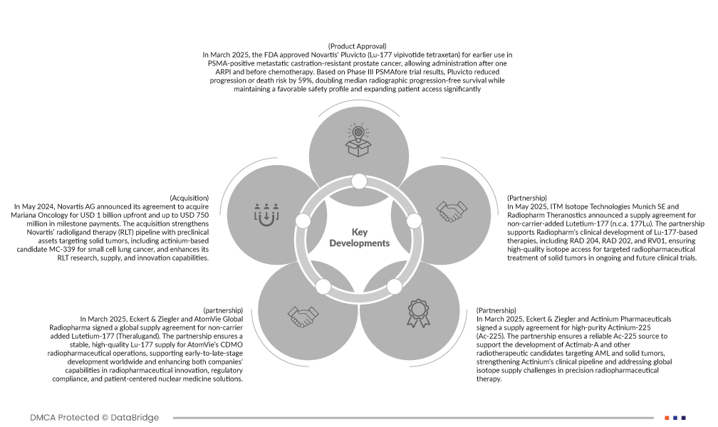 Novartis AG (Suisse), Eckert & Ziegler Allemagne, ITM Isotope Technologies Munich SE (Allemagne), SHINE Technologies, LLC (États-Unis), Actinium Pharmaceuticals, Inc. (États-Unis), Alpha Tau Medical Ltd. (Israël), ARICEUM THERAPEUTICS (Allemagne), Bayer AG (Allemagne), Curium (États-Unis), IONETIX Corporation (États-Unis), Isotopia (Israël), Lantheus (États-Unis), Lilly (États-Unis), Niowave (États-Unis), NMR (États-Unis), Oncoinvent (Norvège), Orano Group (Paris), Radiopharm Theranostics Limited (Australie), Telix Pharmaceuticals Limited (Australie) et Terthera (Pays-Bas), entre autres
