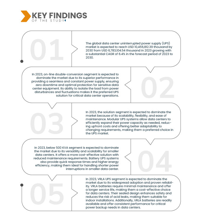Data Bridge Market Research analyses that the Data Center Uninterrupted Power Supply (UPS) Market is expected to grow at a CAGR of 6.4% in the forecast period of 2023 to 2030 and is expected to reach USD 10,456,812.39 thousand by 2030. The continuous growth of cloud computing, colocation, and edge computing services further contributes to the need for UPS solutions.