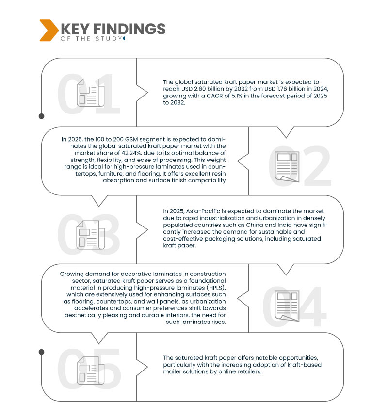 가정 및 사무용 가구에 심미적이고 친환경적이며 내구성이 뛰어난 소재에 대한 소비자 수요가 증가함에 따라, 포화 크라프트지는 다재다능함과 비용 효율성으로 인기를 얻고 있습니다. 선반, 조리대, 바닥재의 라미네이트 표면 제작에 사용되며, 뛰어난 내구성, 높은 강도, 그리고 뛰어난 인열 강도를 제공합니다. 지속 가능한 디자인 트렌드 또한 포화 크라프트지의 매력을 더욱 높이고 있습니다. 포화 크라프트지는 재활용이 가능하고 환경 친화적이어서 가구 및 인테리어 디자인 분야의 제조업체와 소비자 모두에게 매력적인 선택지가 되고 있습니다. 이러한 사용 증가는 시장 확대에 기여하고 있습니다.