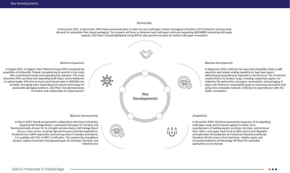 Data Bridge Market Research는 글로벌 포화 크라프트지 시장에서 운영되는 주요 회사로 International Paper(미국), WestRock Company(미국), Mayr-Melnhof Karton AG(오스트리아), Mondi(오스트리아), Ahlstrom(핀란드)을 분석했습니다.