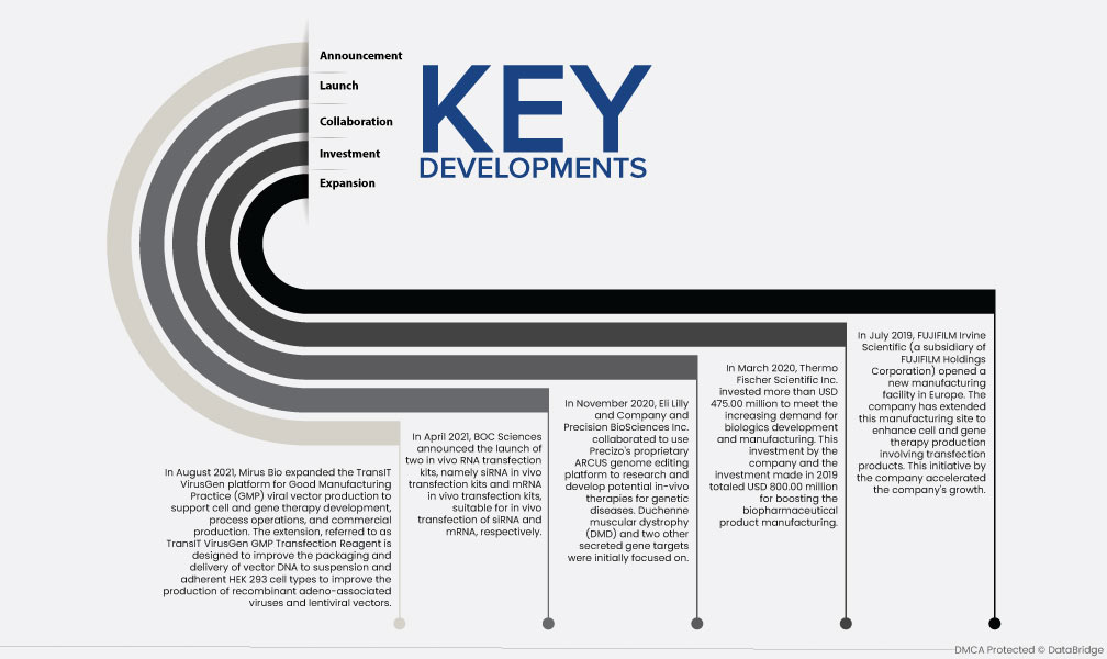Mirus Bio LLC. (U.S.), Promega Corporation (U.S.), Polyplus Transfection (U.S.), Bio-Rad Laboratories, Inc. (U.S.), Merck KGaA (Germany), Lonza (Switzerland), MaxCyte, Inc. (U.S.), Altogen Biosystems (U.S.), SBS Genetech, FUJIFILM Irvine Scientific (A Subsidiary of FUJIFILM Holdings Corporation) (U.S.), Avanti Polar Lipids (A Subsidiary of Croda International Plc) (U.S.), PerkinElmer chemagen Technologie GmbH (A Subsidiary of PerkinElmer Inc.) (Germany), Cytiva (Denmark), Geno Technology Inc., USA (U.S.), R&D Systems, Inc. (U.S.), Takara Bio Inc. (Japan), Thermofisher Scientific Inc. (U.S.), Roche Molecular Systems, Inc. (A Subsidiary of F. Hoffmann-La Roche Ltd), OriGene Technologies, Inc. (U.S.), Applied Biological Materials Inc. (abm)(Canada), Beckman Coulter, Inc. (A Subsidiary of Danaher)(Germany), SignaGen Laboratories (U.S.), Genlantis Inc. (U.S.), Ginkgo Bioworks (U.S.), among others.