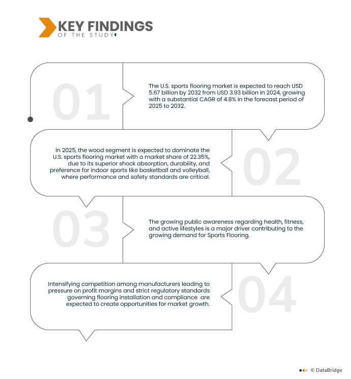По данным маркетингового исследования Data Bridge, ожидается, что объем рынка спортивных напольных покрытий в США к 2032 году достигнет 5,67 млрд долларов США по сравнению с 3,93 млрд долларов США в 2024 году, демонстрируя существенный среднегодовой темп роста в 4,8% в прогнозируемый период с 2025 по 2032 год.