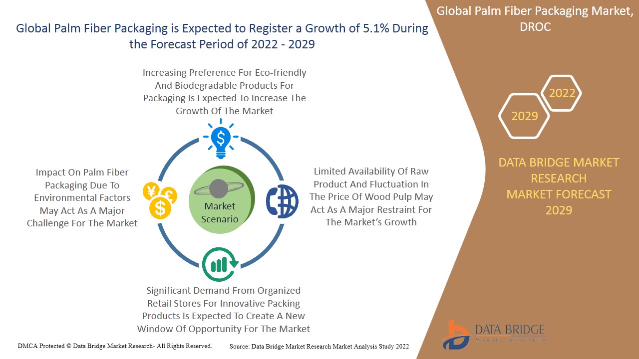 O Mercado global de embalagens de fibra de palma deverá crescer 5,1% com fatores como o aumento da preferência por produtos ecológicos e biodegradável produtos para embalagens, aumento dos serviços de entrega de comércio eletrônico em todo o mundo, necessidade de materiais com menor pegada de carbono e design de uso inovador de subprodutos/sobras na indústria de embalagens.