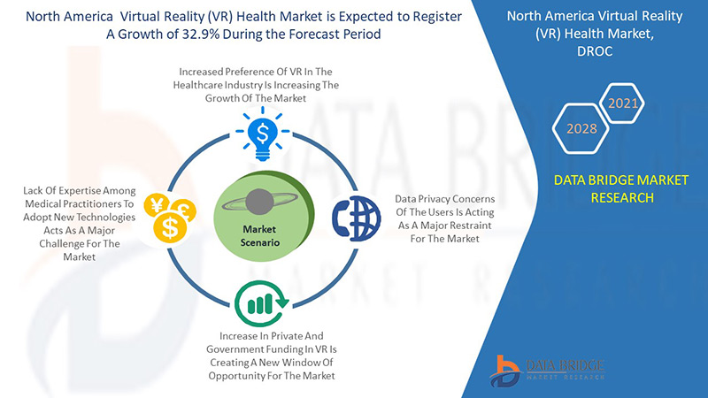 O Mercado de saúde de realidade virtual (VR) da América do Norte está previsto um crescimento de 32,9% CAGR com fatores como a maior preferência da RV no setor de saúde e a crescente adoção da realidade virtual (RV) em diversas aplicações, como educação médica, atendimento ao paciente e outros.