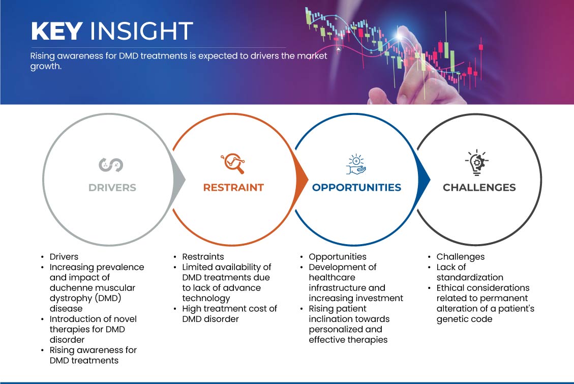 The primary factors expected to drive the market growth are the rising awareness of DMD treatment and the introduction of novel therapies for DMD disorder. In addition, rising prevalence and impact of DMD disorder are another key driver expected to drive market growth. A rise in the number of clinical trials is a recent trend is also expected to drive the market growth. However, the limited availability of DMD treatment due to advanced technology and the high treatment cost of DMD disorder are expected to restrain market growth.