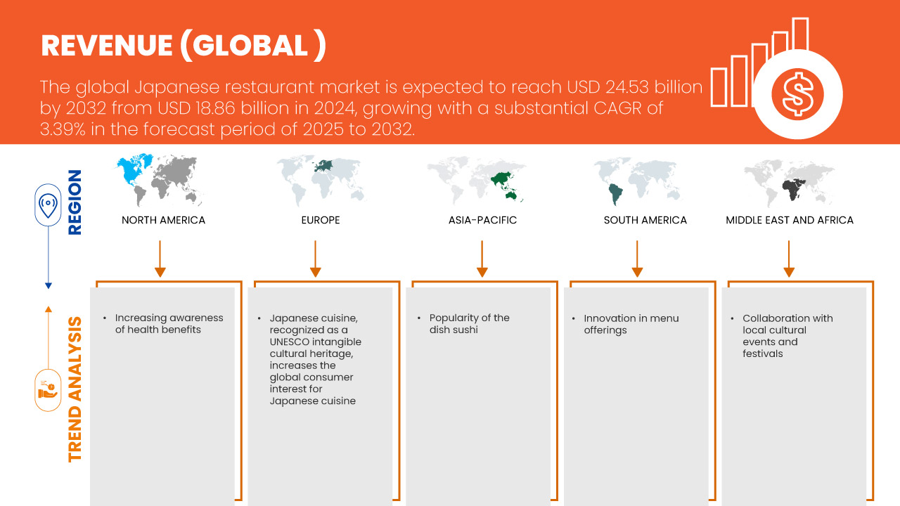- The global Japanese restaurant market was valued at USD 18.86 billion in 2024 and is expected to reach USD 24.53 billion by 2032