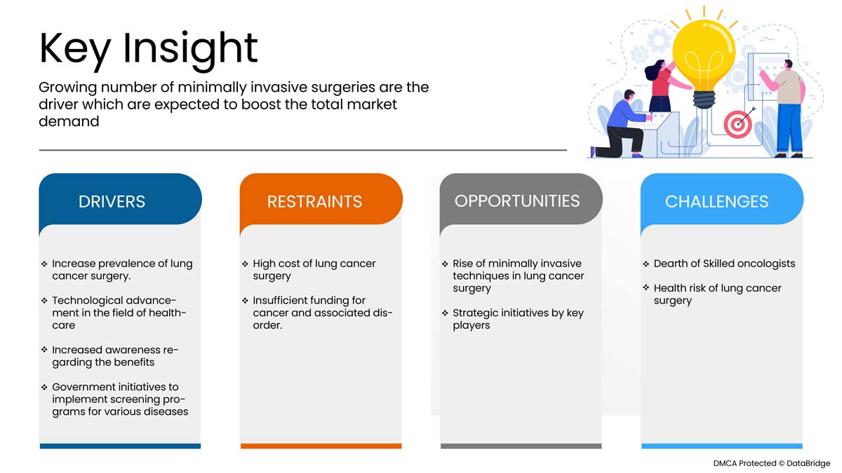 However, the barriers to the lung cancer surgery techniques and high cost of lung cancer surgery process in some of the regions may impede the less growth of the lung cancer surgery hampering the growth of the market. Additionally, high competition in medical technology industries and long lead time for the overseas qualification can be the challenging factors for the growth of the market
