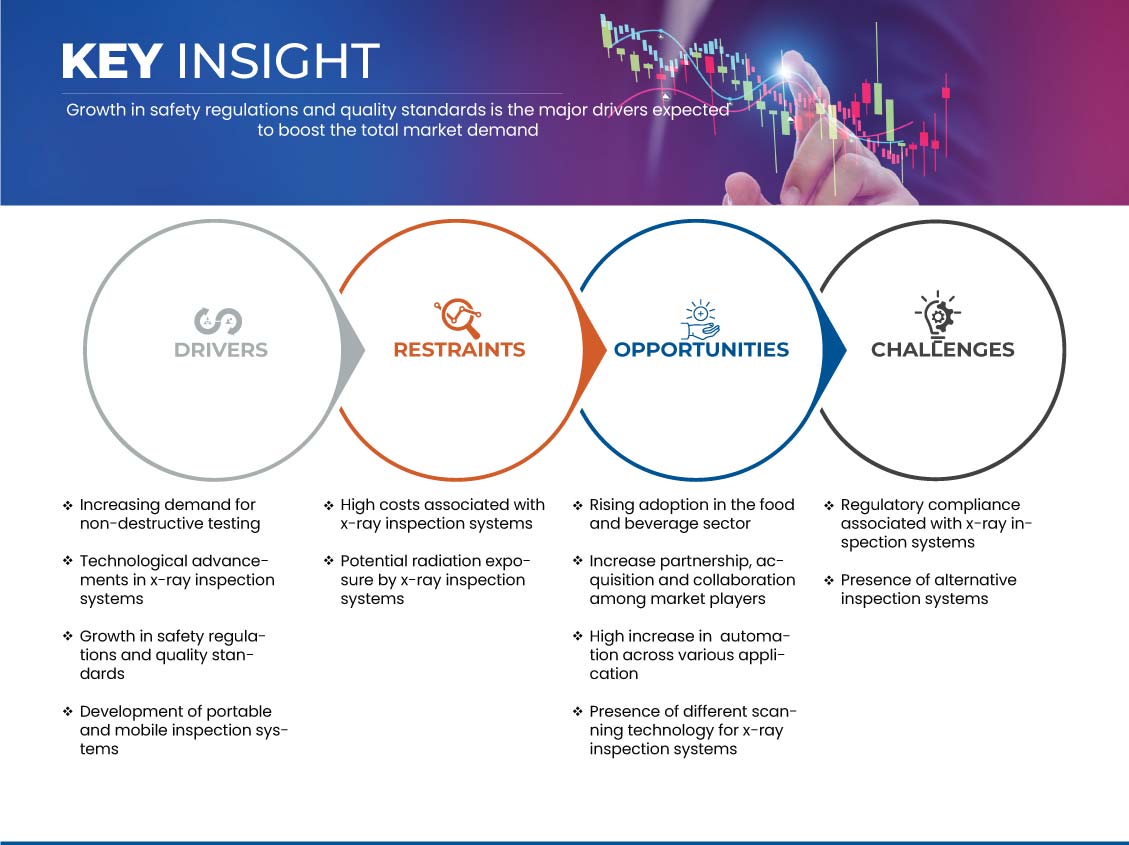 Due to stringent government regulations that demand security and increasing demand for non-destructive testing are driving factors in the global x-ray inspection systems market. However, security threats associated with x-ray inspection systems and x-ray inspection systems is restraining the growth of the global x-ray inspection systems market. Rising adoption in food and beverage and other industries is estimated to provide opportunities for global x-ray inspection systems market growth. However, the lack of regulatory compliance associated with x-ray inspection systems has become a challenge for market growth.