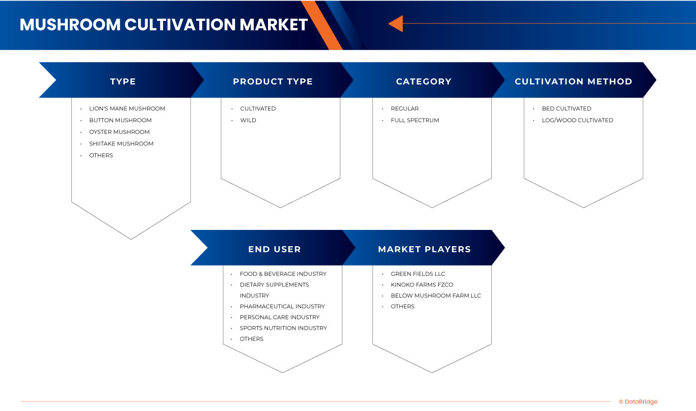 U.A.E. Mushroom Cultivation Market Segmentation, By Type (Shiitake Mushroom, Button Mushroom, Oyster Mushroom, Lion's Mane Mushroom, and Others), Product Type (Cultivated and Wild), Category (Regular and Full Spectrum), Cultivation Method (Bed Cultivated and Log/Wood Cultivated), End User (Food & Beverage Industry, Dietary Supplements Industry, Pharmaceutical Industry, Personal Care Industry, Sports Nutrition Industry, and Others) - Industry Trends and Forecast to 2032